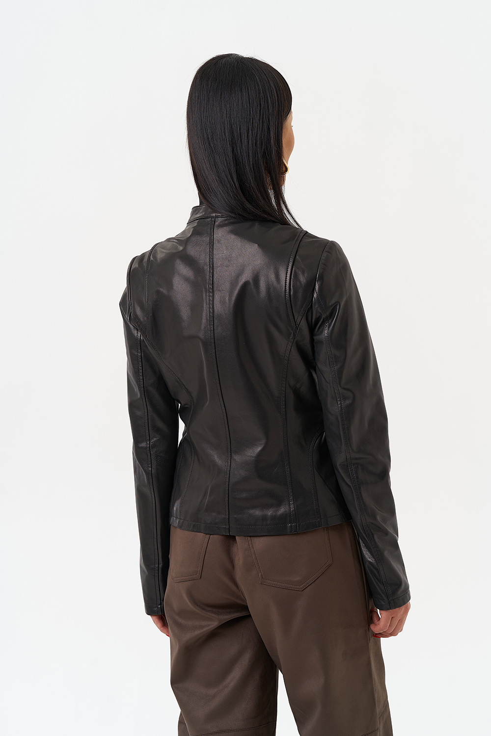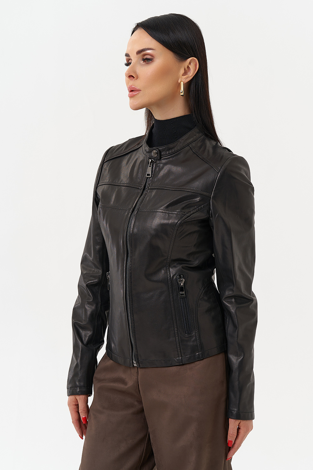 Элегантная женская куртка из натуральной кожи в черном цвете с бронзовым блеском. Классический полуприлегающий фасон подойдет для сдержанных и элегантных образов. Данный оттенок сочетается со всеми цветами, что делает данную куртку базовой в вашем гардеробе. Фигурные вытачки данной модели визуально стройнят. Изделие дополнено аккуратным воротом-стойкой и молнией. Представлен большой размерный ряд от 42 до 52 размера.