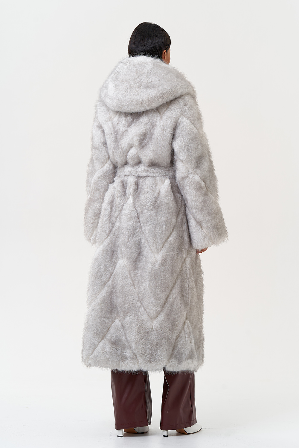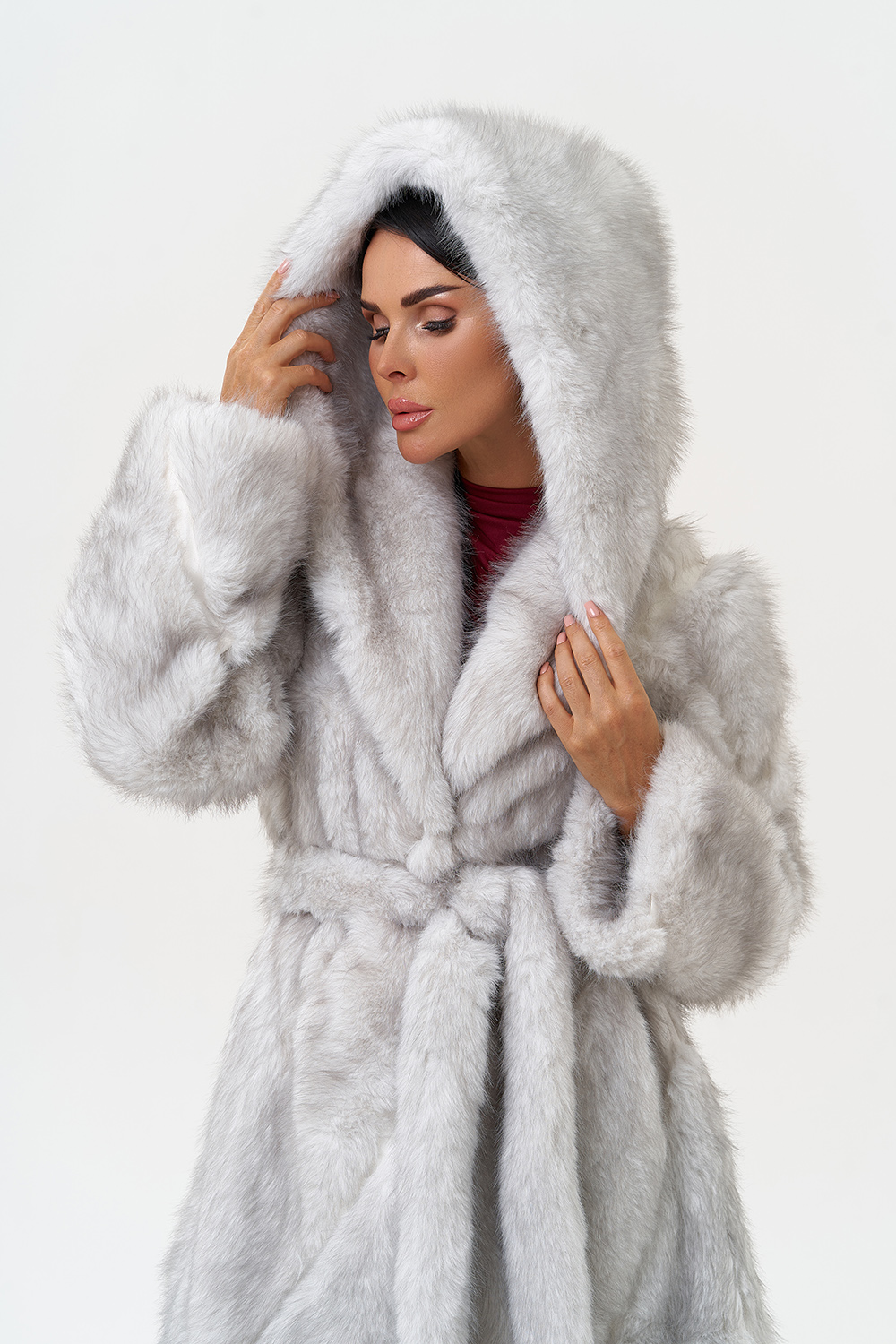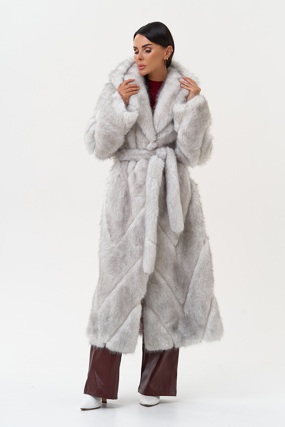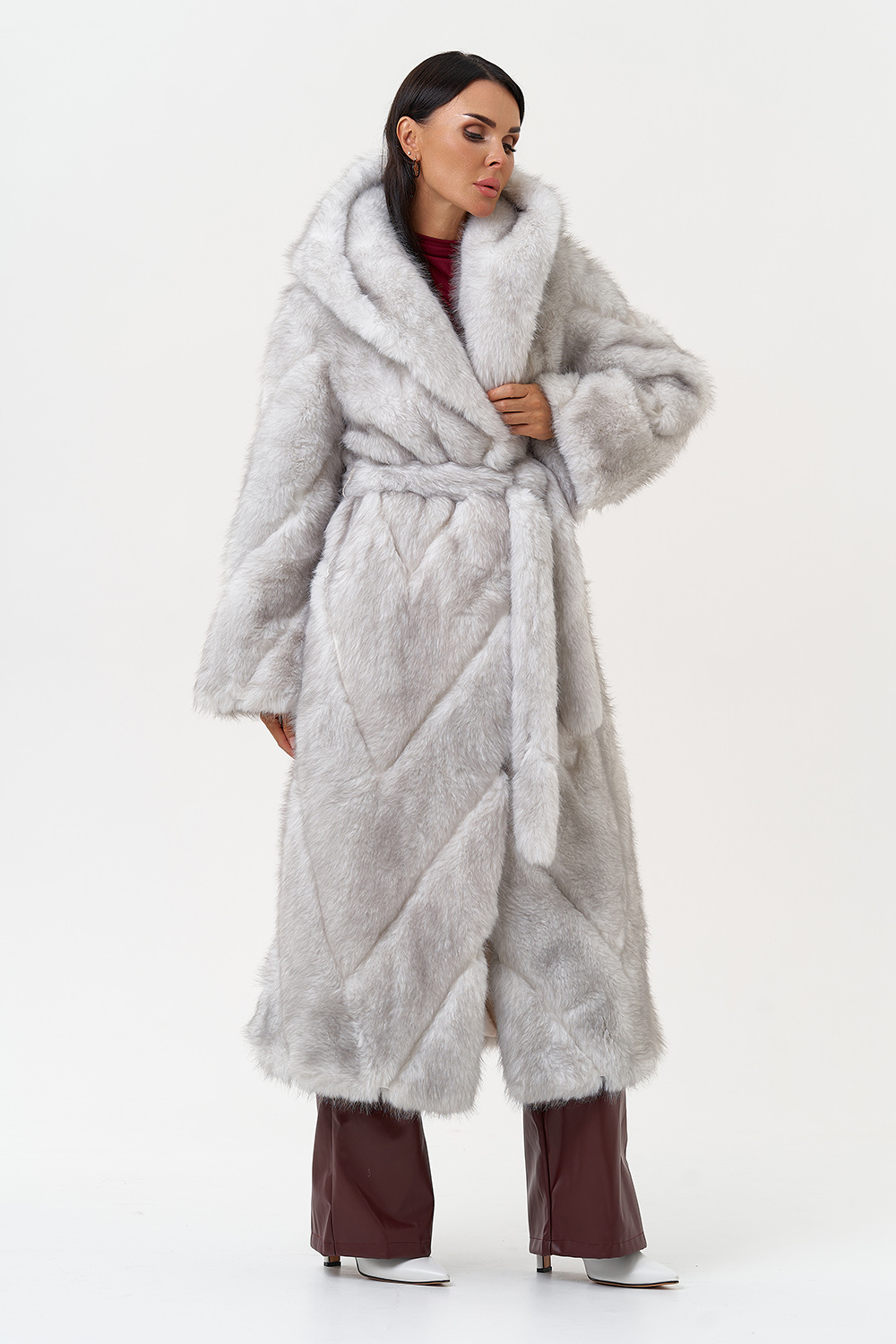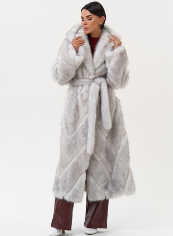 Фасон - прямой Длина изделия - 125 см Цвет - светло-серый (лед) Материал - экомех Состав полотна - полиэстер 100% Подкладка - полиэстер 100% Вид застежки -крючки, пояс Вид ворота - капюшон Фасон рукава - встачной, длинный |