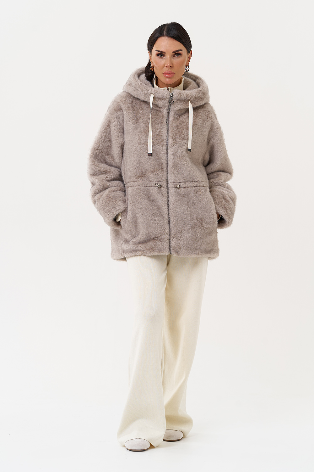 Фасон - прямой Длина изделия - 70 см Цвет - серый Материал - экомех Состав полотна - полиэстер 100% Подкладка - полиэстер 100% Вид застежки - молния, кулиска на талии Вид ворота - капюшон Фасон рукава - спущенное плечо, длинный |